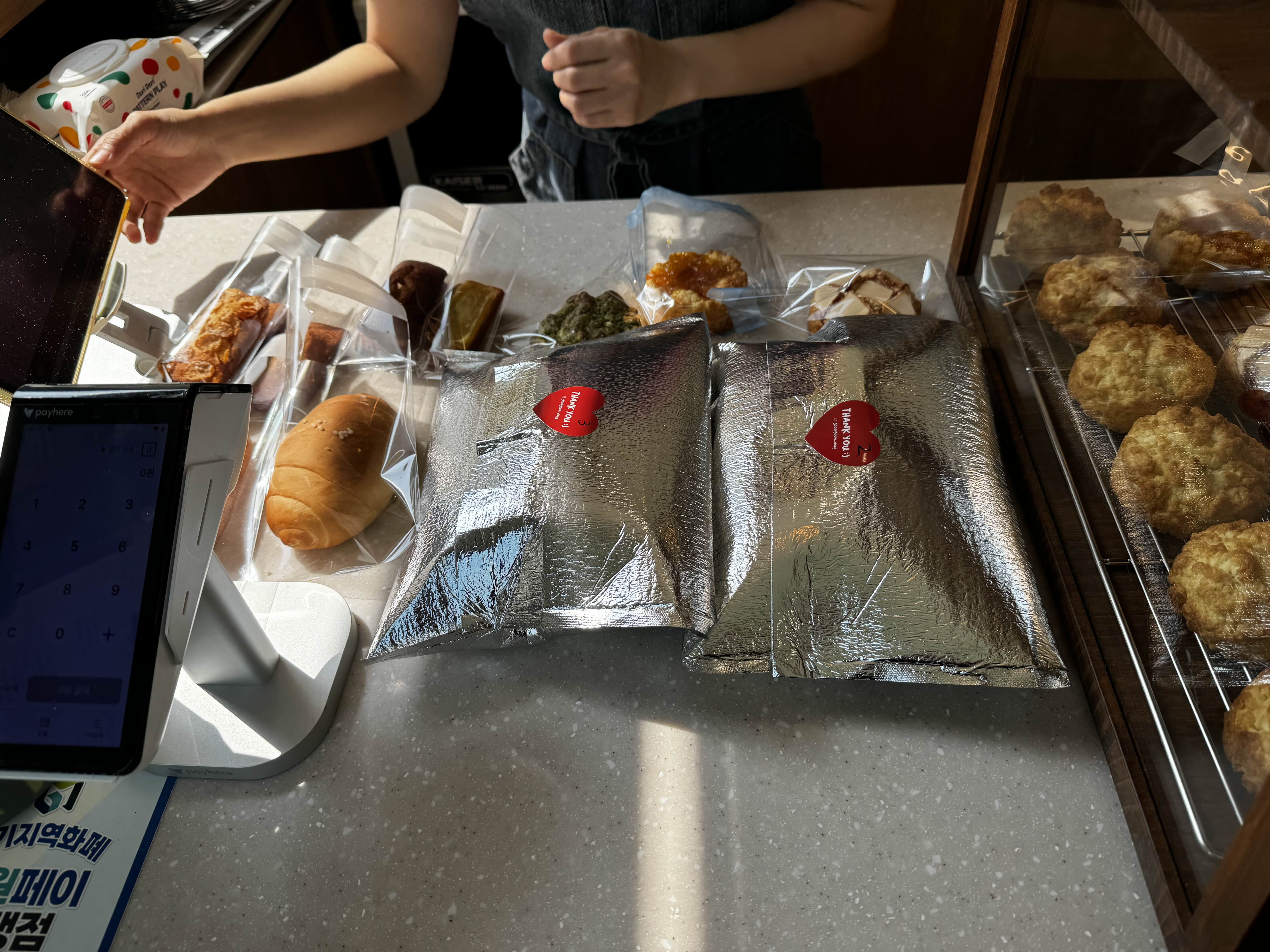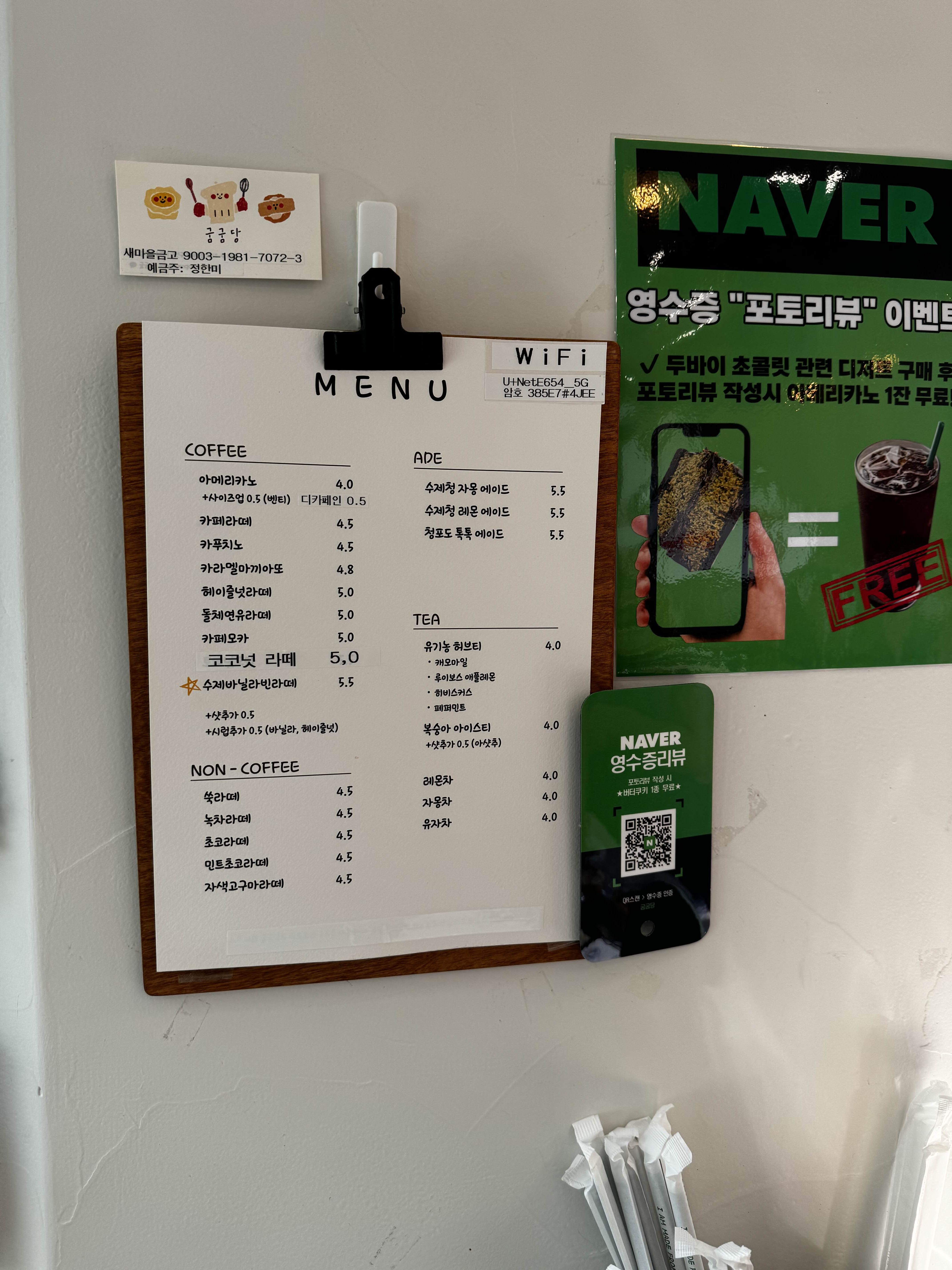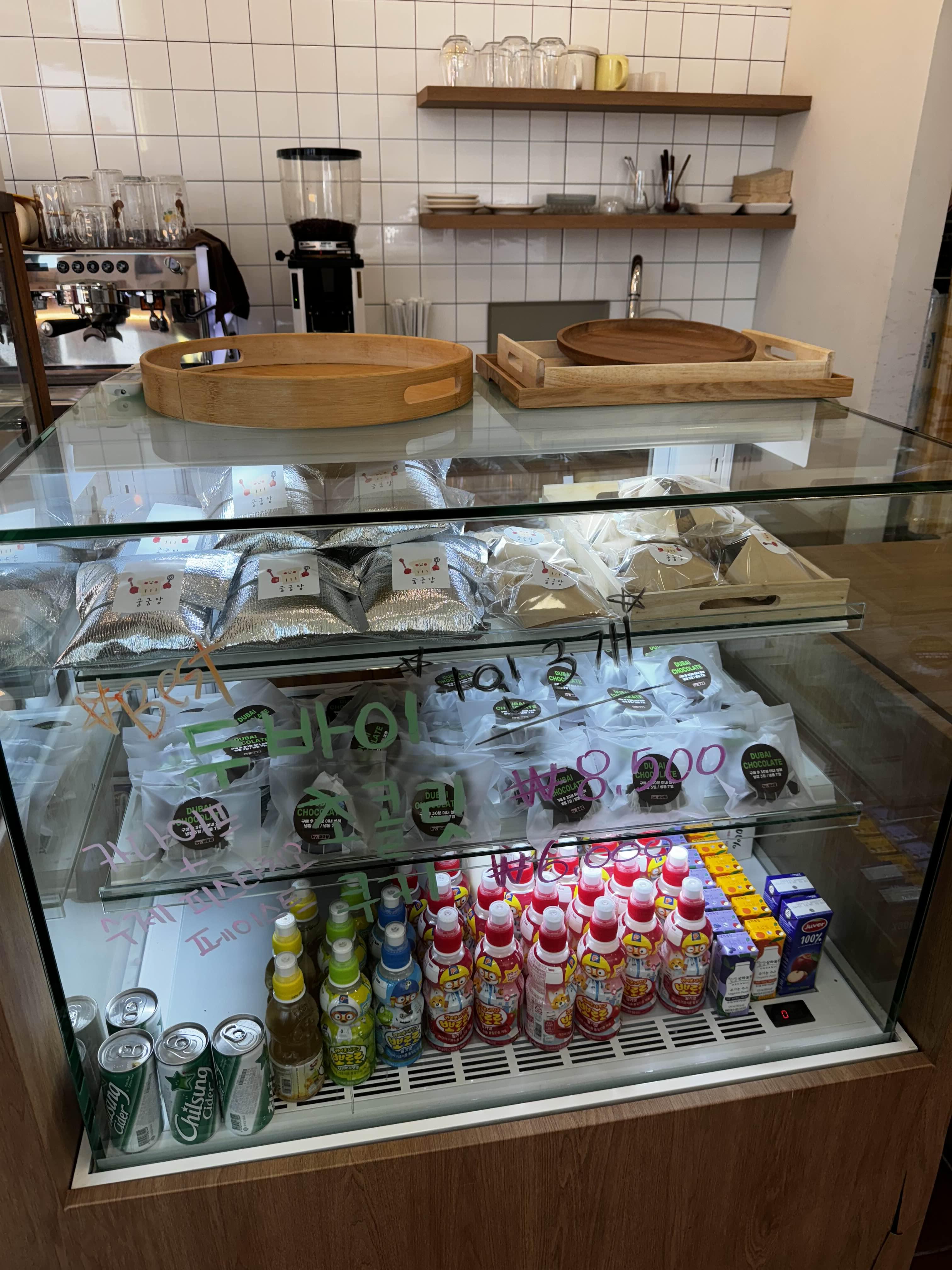 호매실에 도착해서 굼굼당을 찾았는데, 가게 내부는 작지만 아기자기한 분위기가 마음에 들었어요. 미리 예약해둔 두바이 초콜릿과 두바이 쿠키 외에도 휘낭시에, 스콘, 소금빵까지 몇 가지 더 구매했죠. 가게에서는 커피도 판매하고 있었는데, 네이버 후기에 두바이 초콜릿 후기를 올리면 저렴하게 아이스 아메리카노를 구매할 수 있는 이벤트도 하고 있더라고요. 하지만 저는 디저트에 집중하기 위해 커피는 패스했어요.